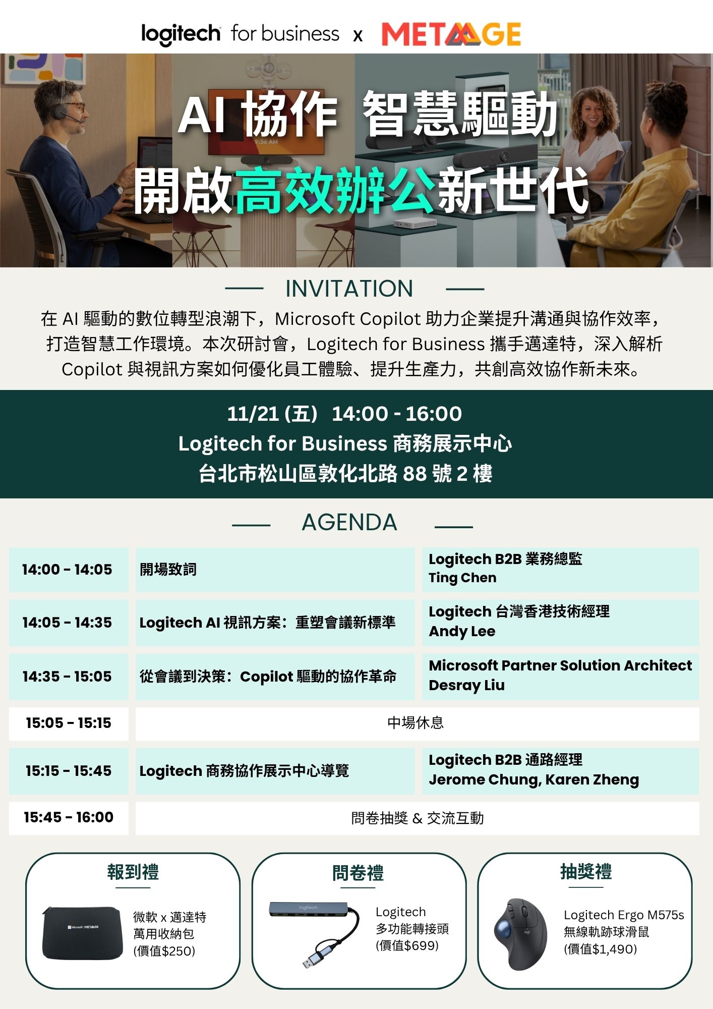 地點及地址 日期與時間 報名連結 Logitech for Business 商務展示中心