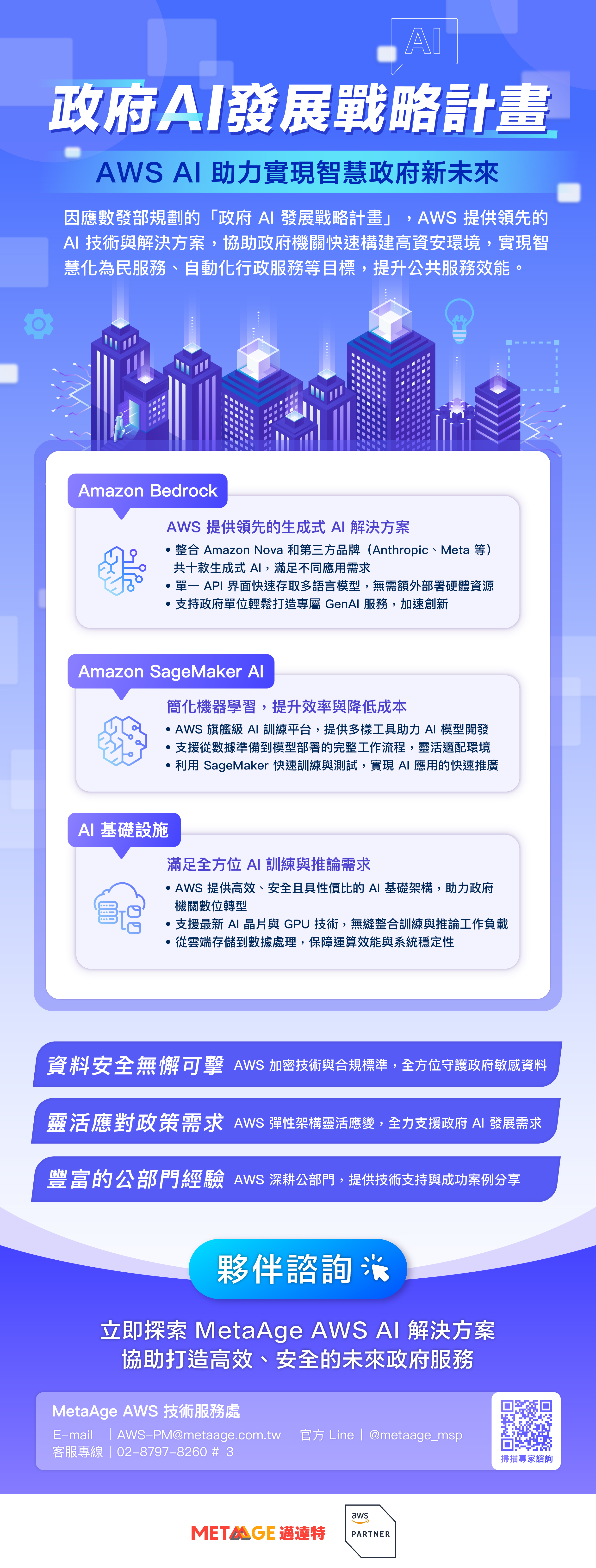 AWS 以卓越的加密技術與全球合規標準,全面保障政府單位機敏資料安全;運用彈性架構靈活應對政策需求,助力 AI 發展戰略各階段;更憑藉深耕全球公部門的豐富經驗,提供技術支持與成功案例分享。立即聯絡我們,探索 MetaAge AWS AI 解決方案,為您打造高效、安全的「智慧」政府服務!