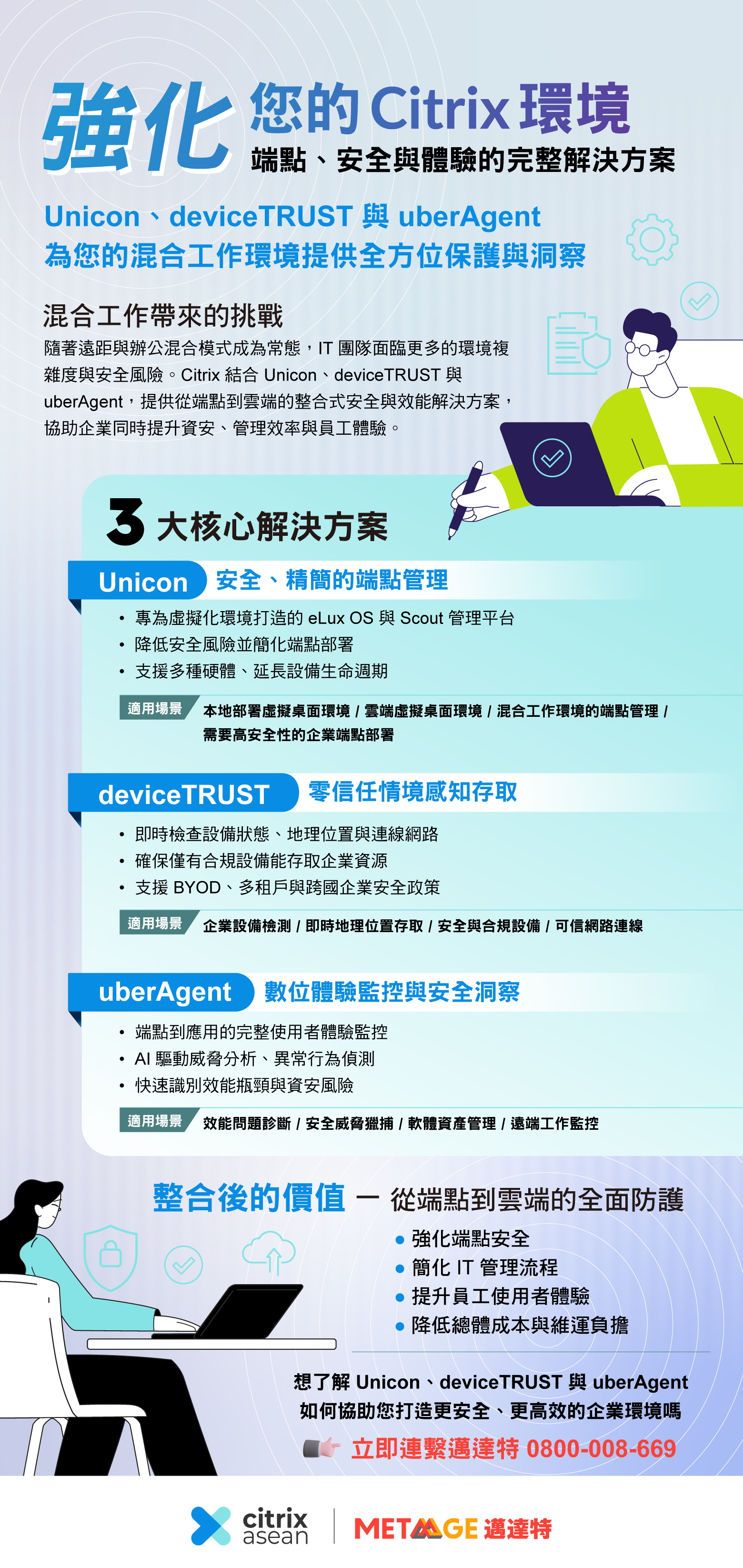 隨著遠距與辦公混合模式成爲常態,IT 團隊面臨更多的環境複雜與安全風險。Citrix 結合 Unicon、deviceTRUST 與 uberAgent,提供從端點到雲端的整合式安全與效能解決方案,協助企業同時提升資安、管理效率與員工體驗。