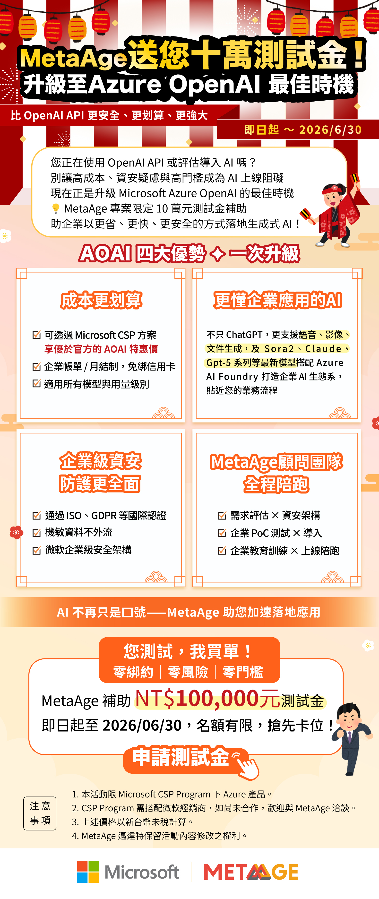 您正在使用 OpenAI API 或評估導入 AI 嗎?別讓高成本、資安疑慮與高門檻成爲 AI 上線阻礙,現在正是升級 Microsoft Azure OpenAI 的最佳時機,MetaAge 專案限定 10 萬元測試金補助,助企業以更省、更快、更安全的方式落地生成式 AI !