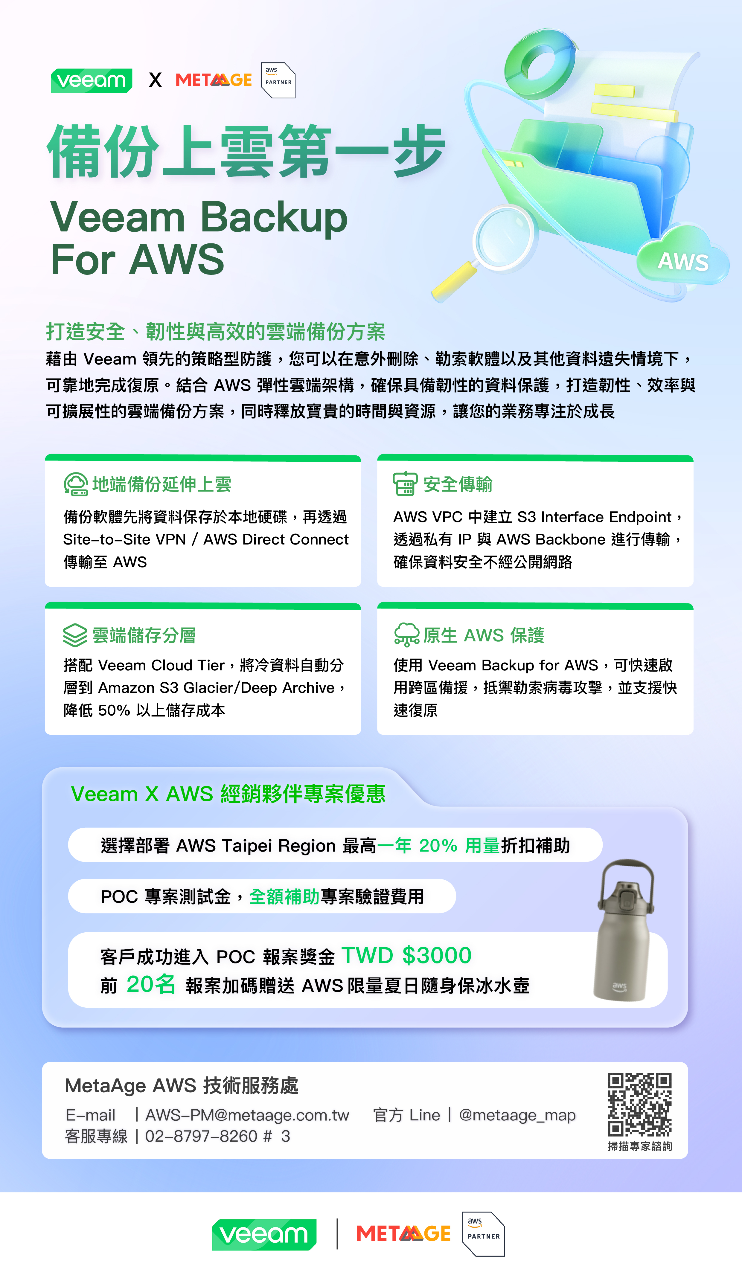 搭配 Veeam Cloud Tier, 可將較少存取的冷資料自動分層至 Amazon S3 Glacier 或 Deep Archive, 在不影響備份可用性的情況下, 有效降低 50% 以上的雲端儲存成本。