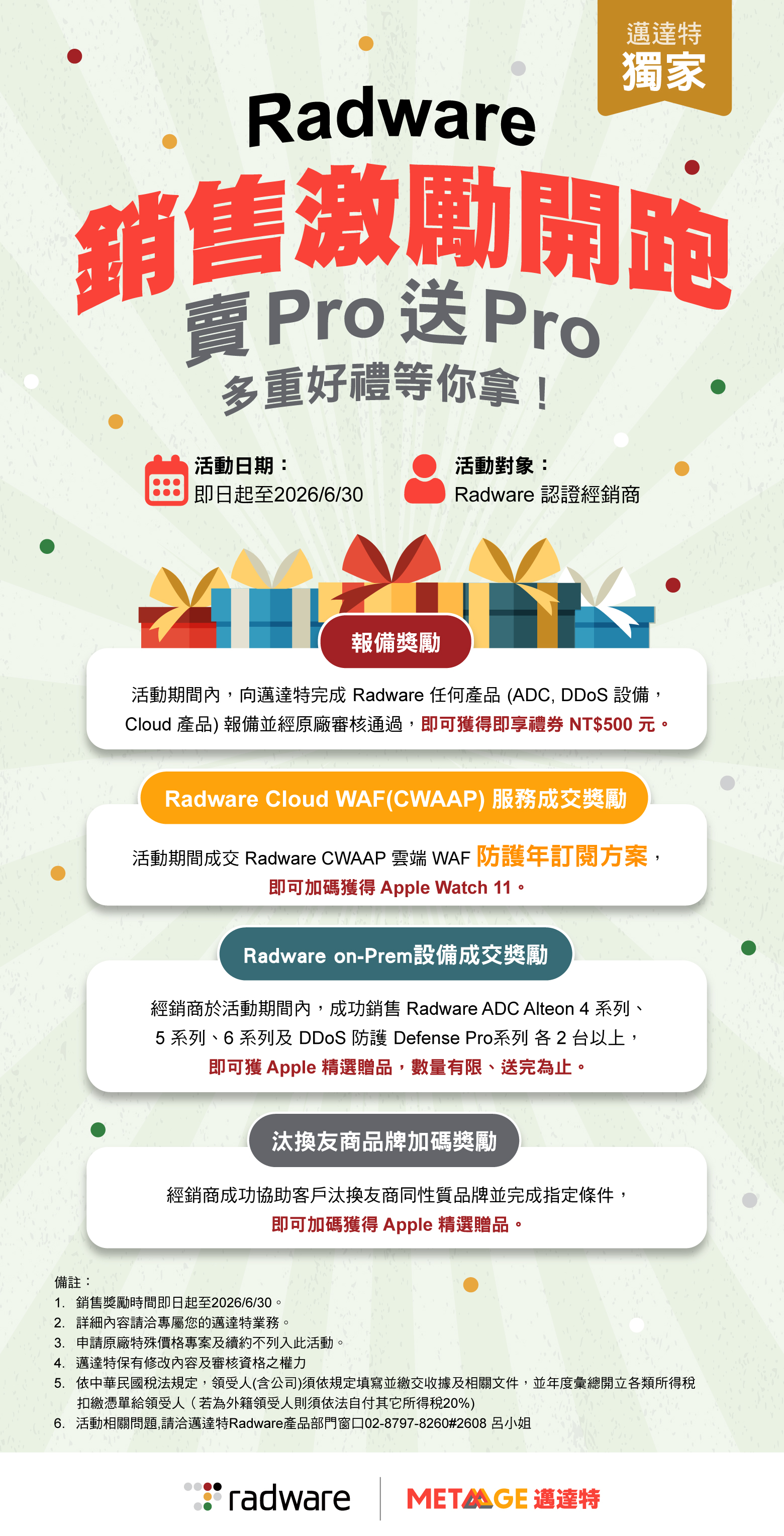 MetaAge 邁達特獨家推出 Radware 經銷商專屬銷售激勵活動,無論是報備、成交雲端方案或硬體設備,甚至是協助汰換競品,皆有豐富獎勵!