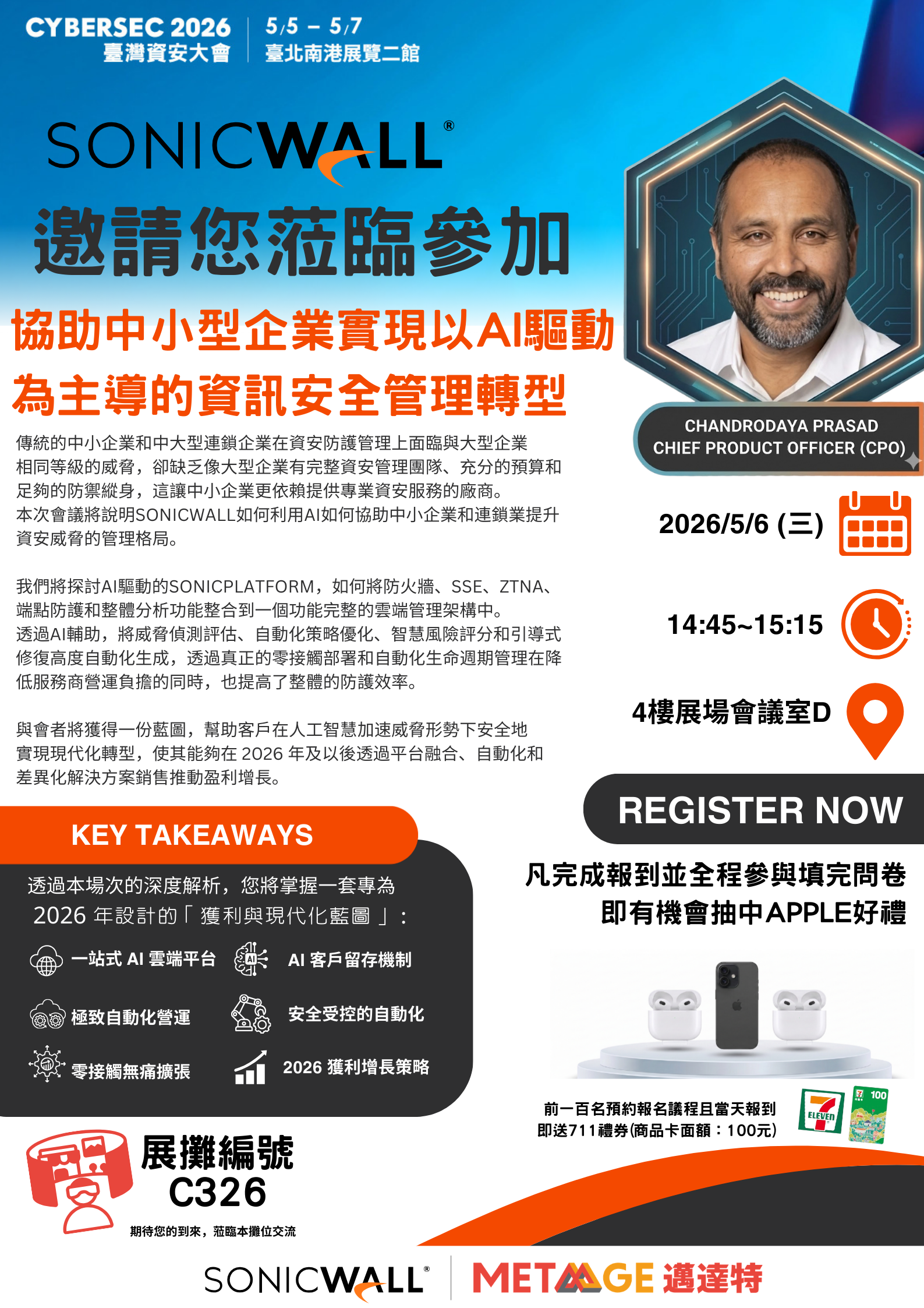本次於 CYBERSEC 2026 臺灣資安大會,SonicWall 將分享如何運用 AI 協助中小型企業推動資訊安全管理轉型,透過平台整合、自動化與智慧化風險判斷,降低營運負擔並強化現代化資安治理能力。