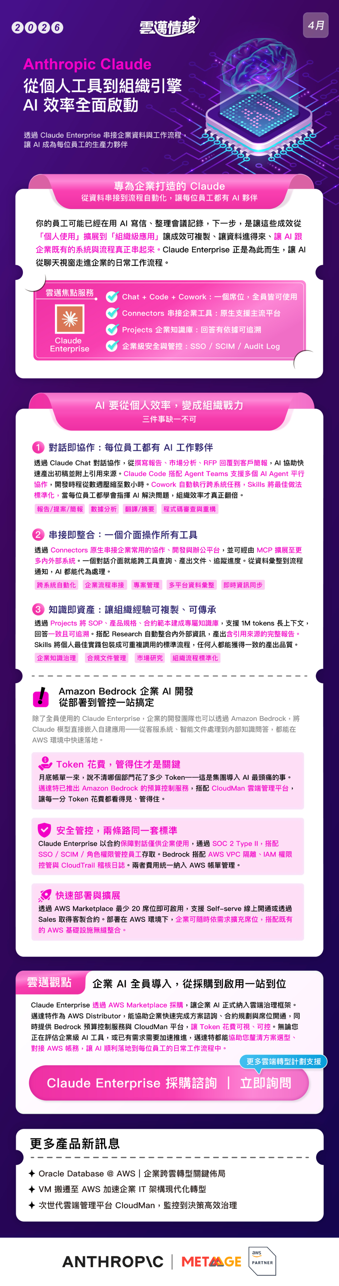 Claude Enterprise 透過 AWS Marketplace 採購,讓企業 AI 正式納入雲端治理框架。邁達特作為 AWS Distributor,除能協助企業完成方案諮詢、合約規劃與席位開通,也可進一步提供 Bedrock 預算控制服務與 CloudMan 雲端管理平台,讓 Token 花費可視、可控,協助企業更有系統地推進 AI 應用,讓 AI 真正走進員工的日常工作流程。