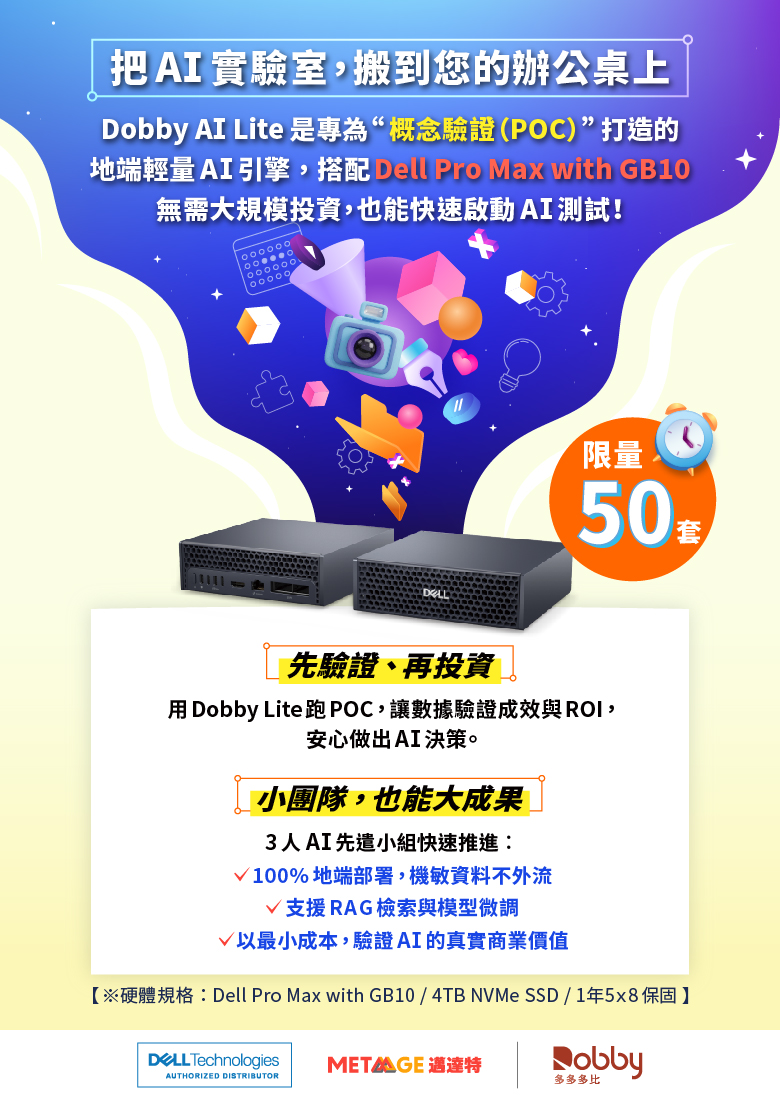 Dell Pro Max with GB10 搭配 Dobby AI Lite,為企業打造可快速啟動的私有 AI 應用環境,適合概念驗證(POC)、資料解析、RAG 檢索與模型微調等場景。透過地端部署與軟硬體整合,企業可在兼顧資料安全的前提下,更有效率地完成 AI 測試與導入。