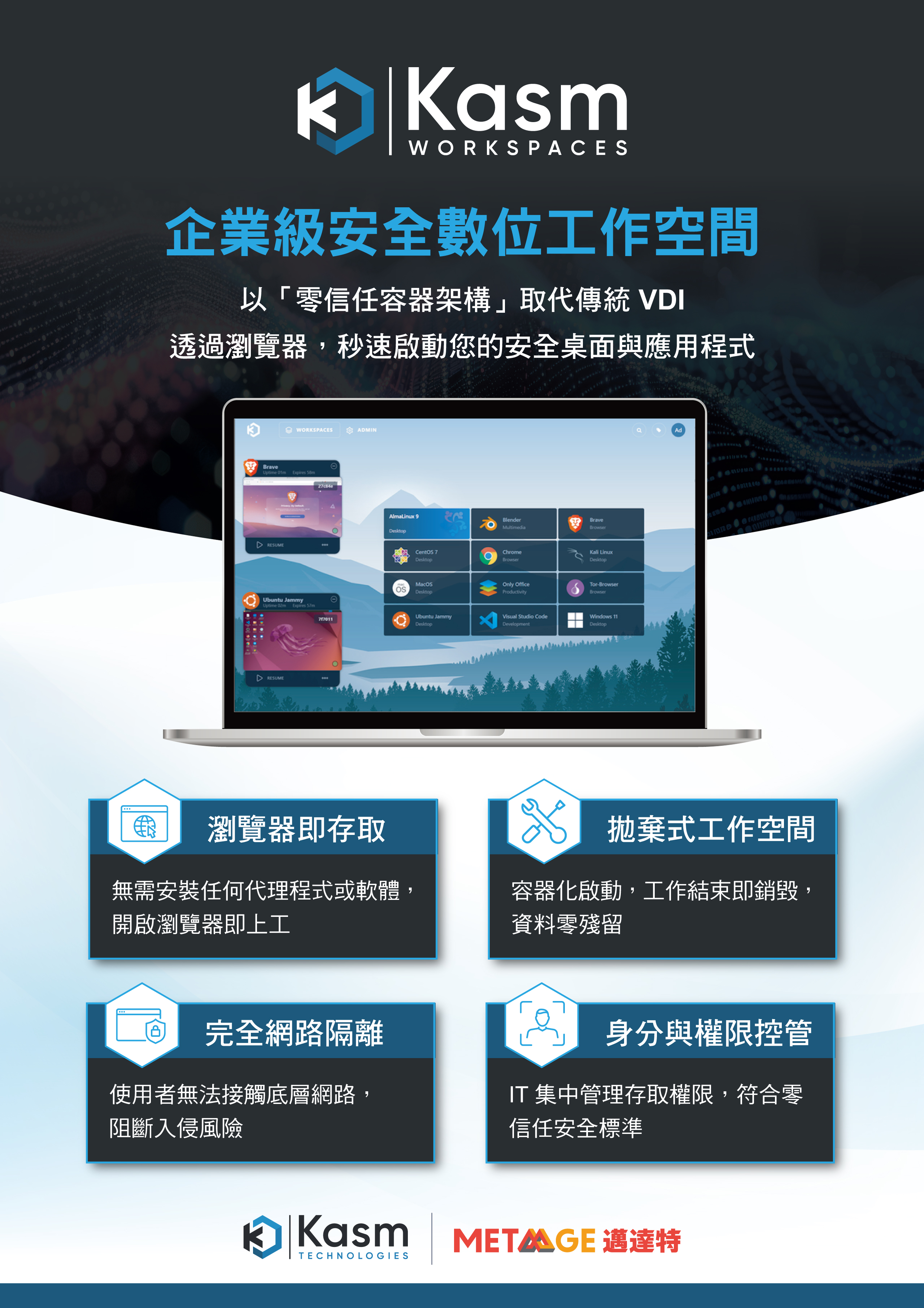 Kasm Workspaces 以零信任容器架構打造企業級安全數位工作空間,協助企業透過瀏覽器快速啟動安全桌面與應用程式,無需安裝代理程式或額外軟體,即可兼顧存取效率與資訊安全。