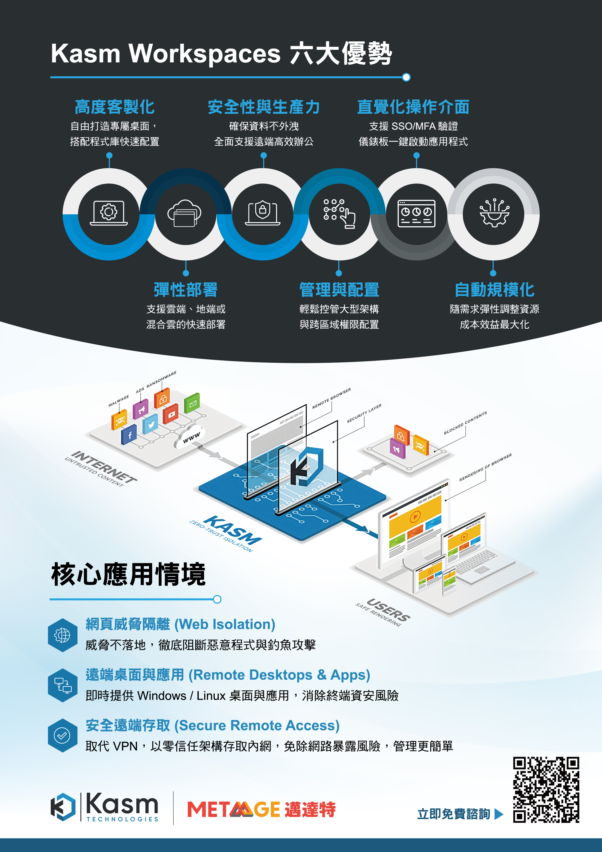 Kasm Workspaces 同時具備高度客製化、彈性部署、自動規模化與直覺操作介面,協助企業在遠端辦公與安全存取需求下,建立更靈活且可控的數位工作環境。