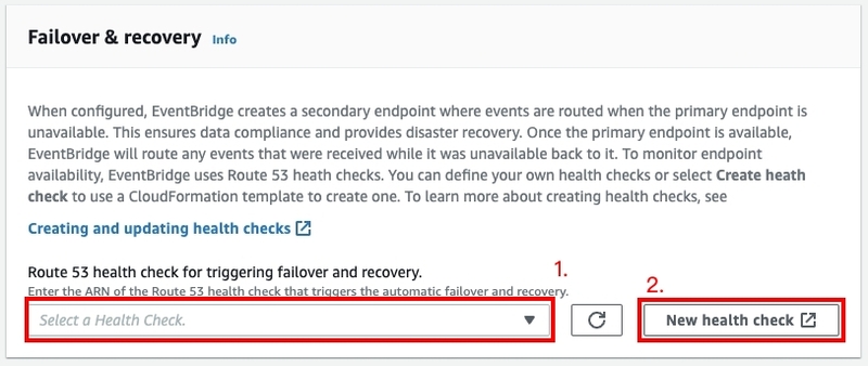 • 為了自動從故障轉移事件中恢復,需要啟用事件複寫。如果您未啟用事件複寫,則必須手動將Route 53健康檢查重置為“健康”,然後事件才會返回到主要區域。