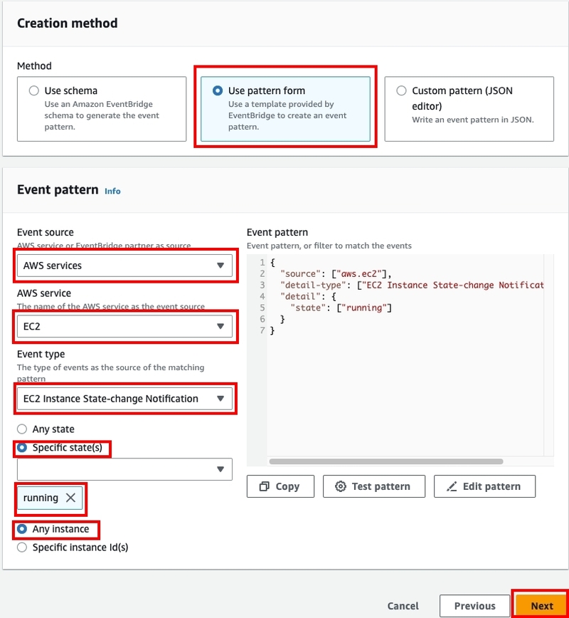 2. Use pattern form:使用樣式表格,AWS 提供一個表格供你填寫以生成Event pattern;