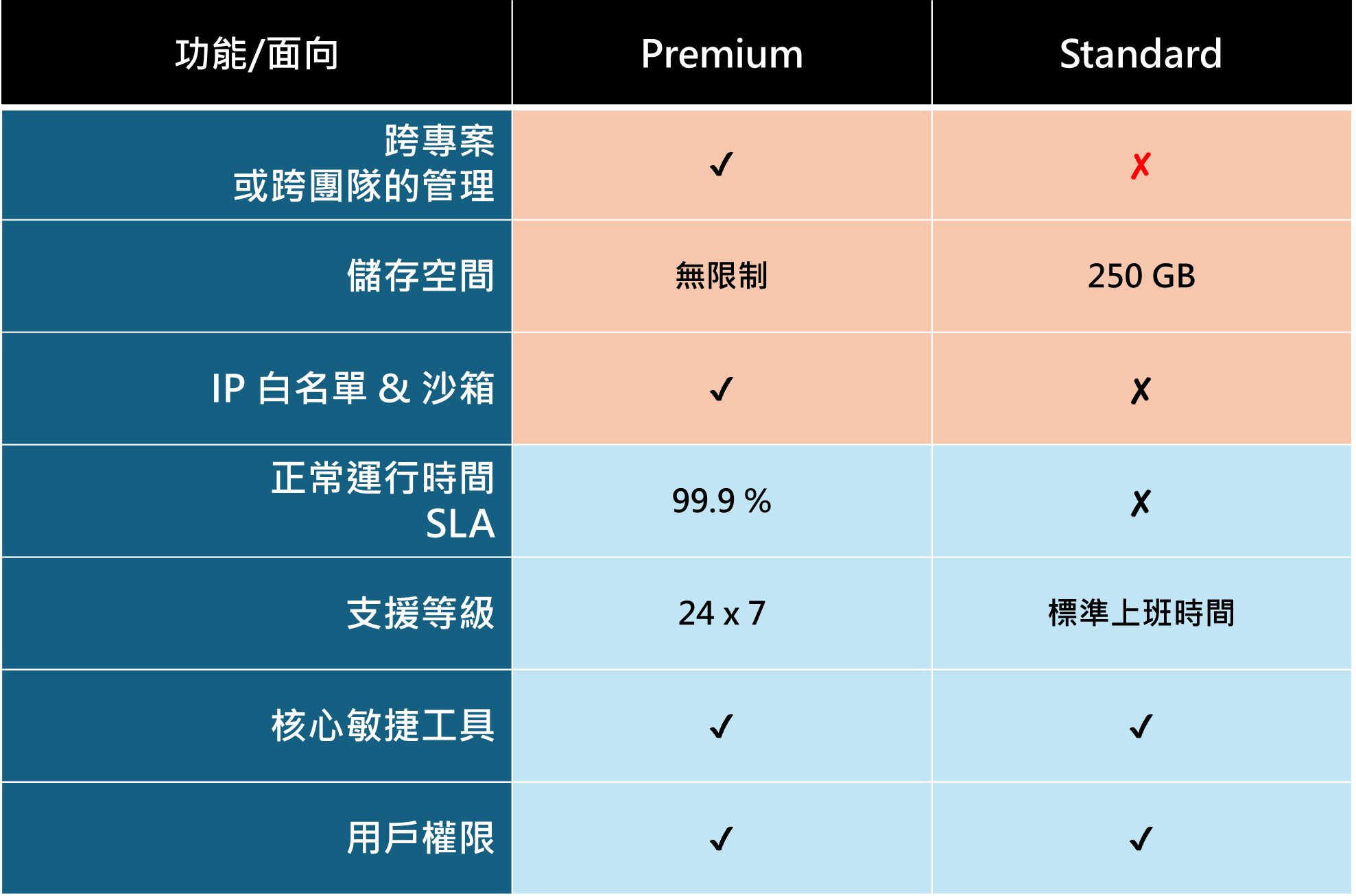 Premium:增加了專為多專案、跨團隊協作以及有更高安全性與可靠性需求的企業所設計的進階功能。如果您的組織,需要面臨: