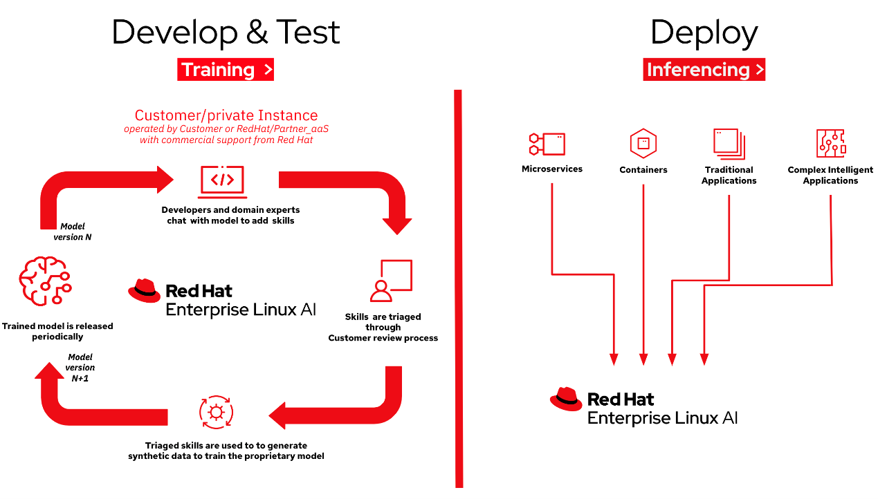 RHEL AI 提供了一套工具 InstructLab,旨在以低成本、低門檻的方式讓專家將自身的知識轉化為大型語言模型,讓企業續改進模型效能。