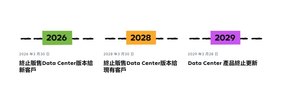 Data Center 產品正式終止服務(EOL)。屆時,您的系統授權將到期並強制轉為「唯讀(Read-only)」模式,且 Atlassian 將全面停止提供任何錯誤修復、安全性漏洞更新與技術支援。